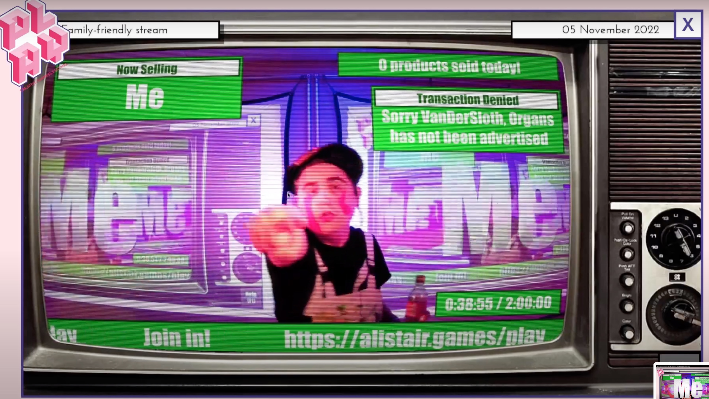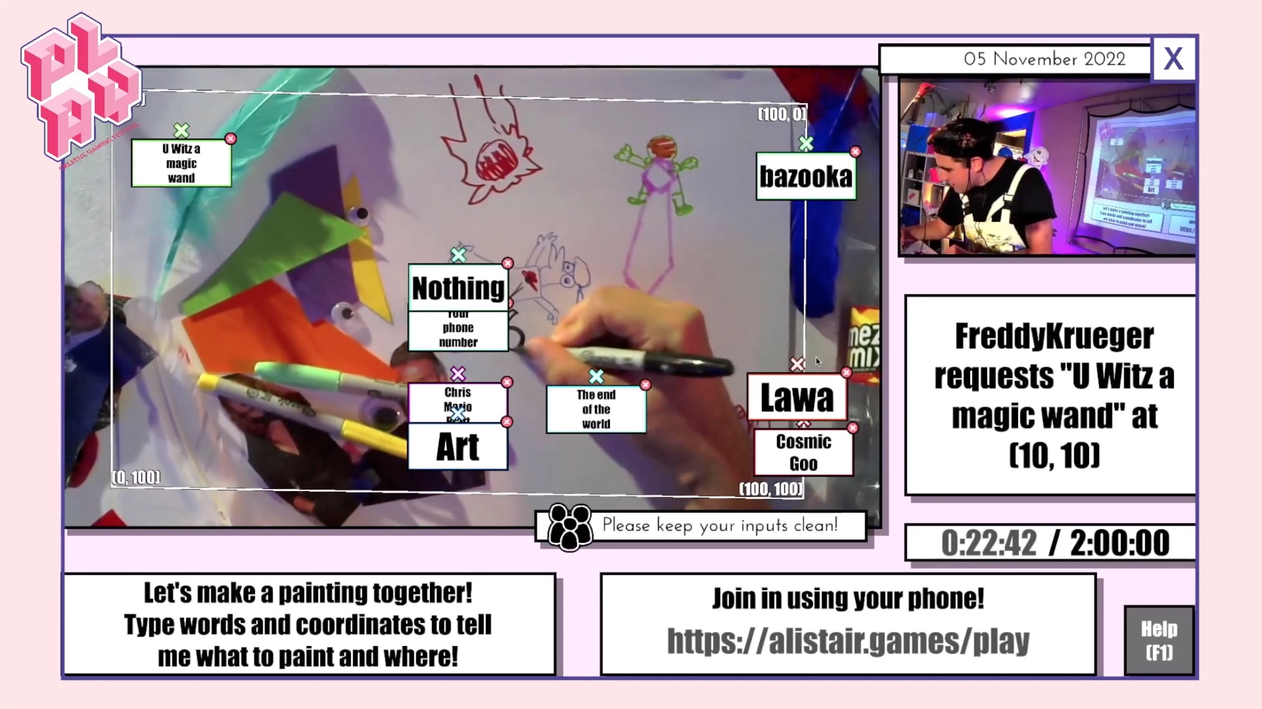 The audience join in by scanning a QR code. This takes them to an HTML page that updates based on the current segment of the show. Here they can type in suggestions that are handled by PHP code in my server, and cached. Regular HTTP calls from a Python script to my server check for new inputs, and pass these on to the game instance.