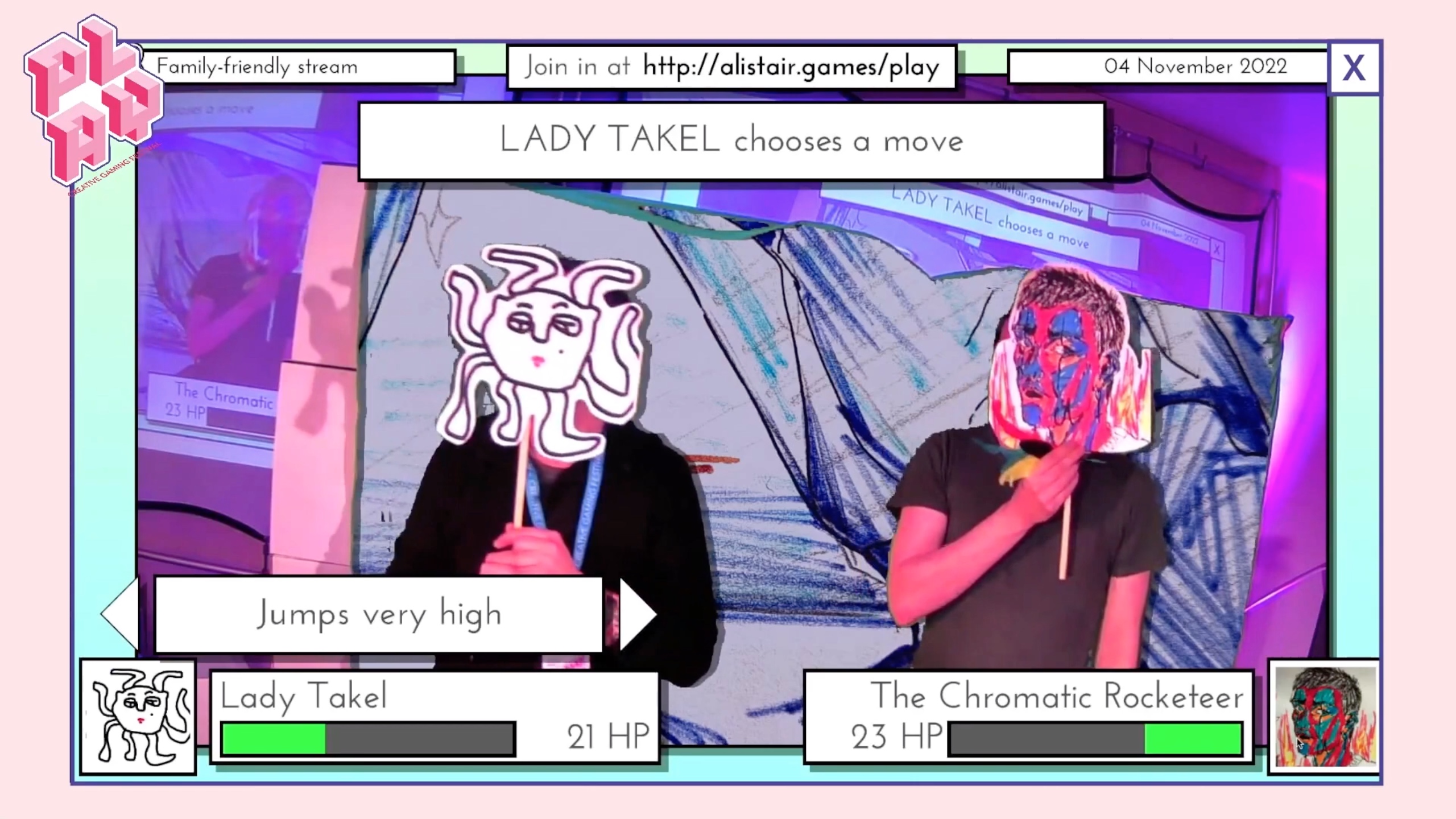 As the end-of-festival show, all these suggestions were used to flesh out a game concept live on stage, with visitors invited to embody the various characters in a final playable showdown: The Ultimate Tournament!