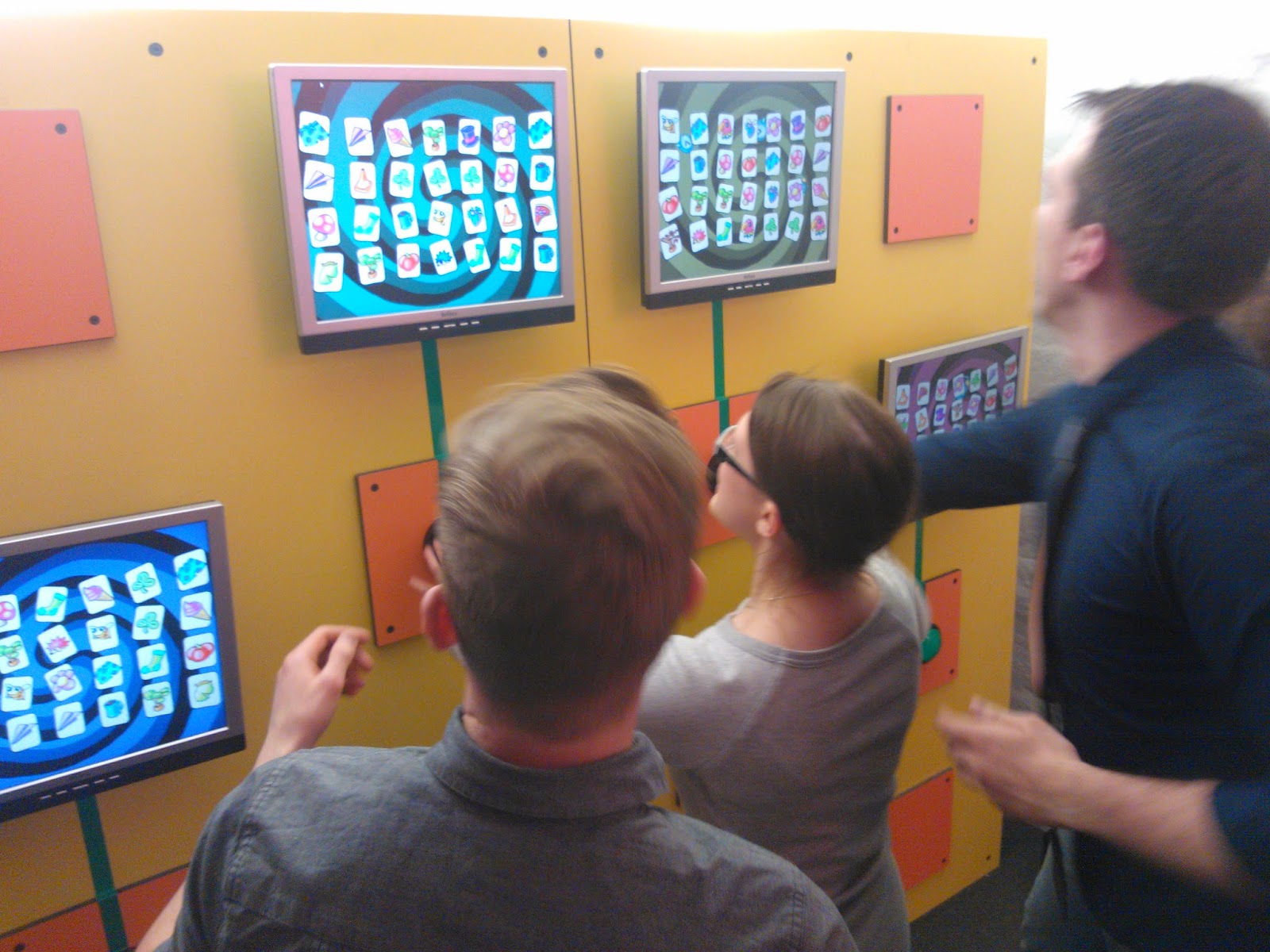 The kit of five buttons - one on each screen, plus a red "start" button - was built from an Arduino wired up to four light-up buttons.
