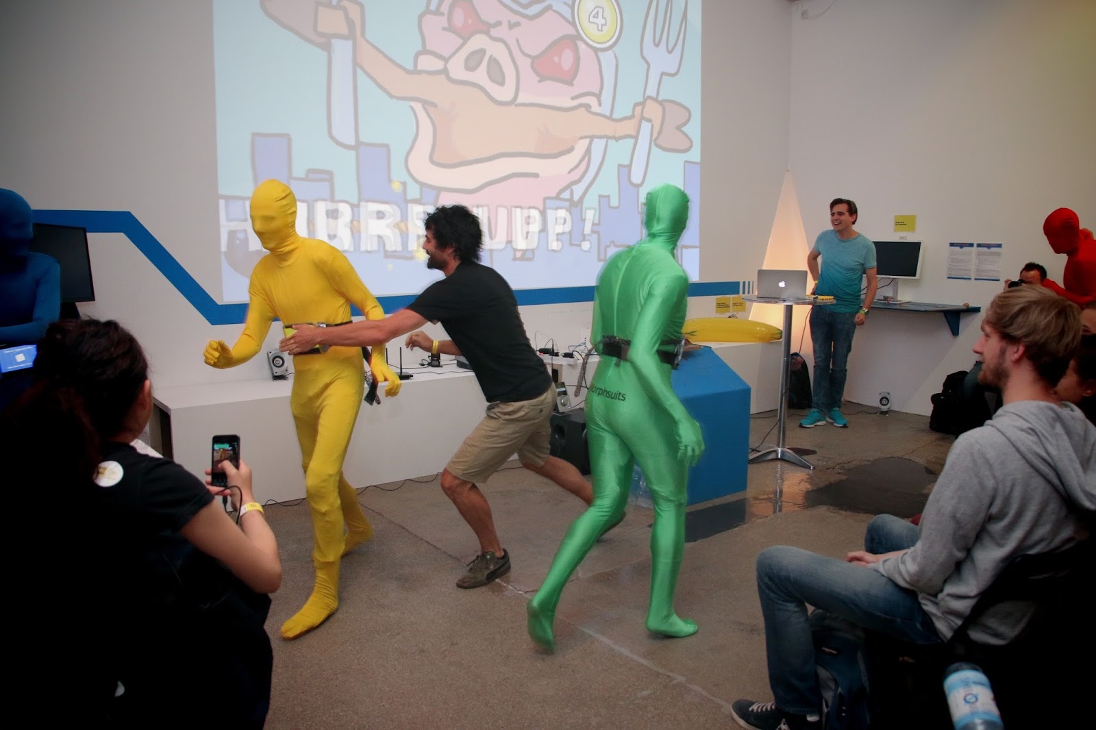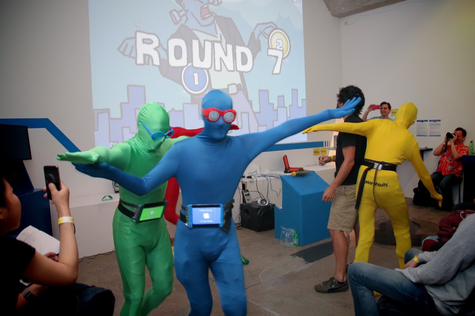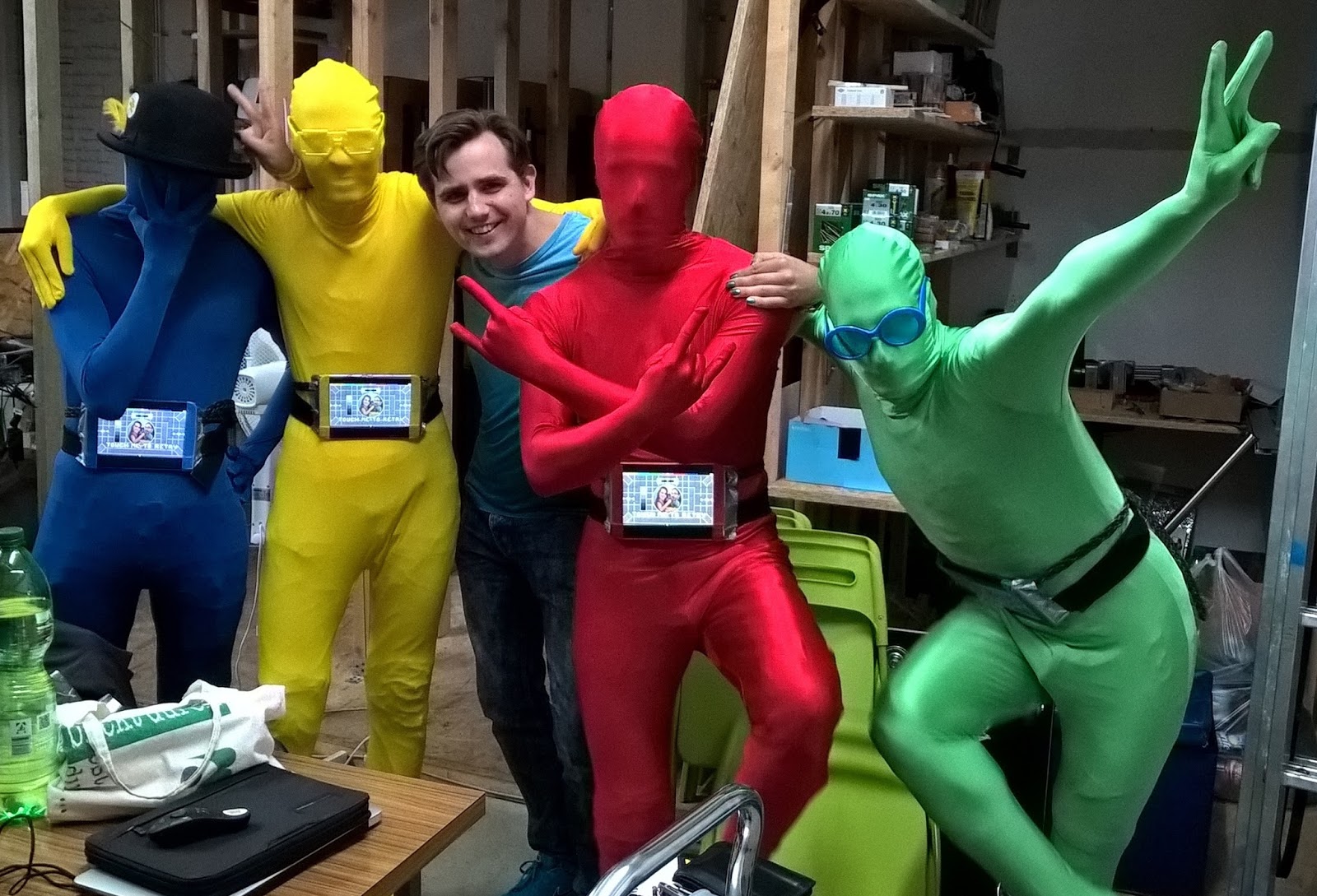 Four morphsuit-clad Power Rangers are the human controllers for this playable improvised experience!
