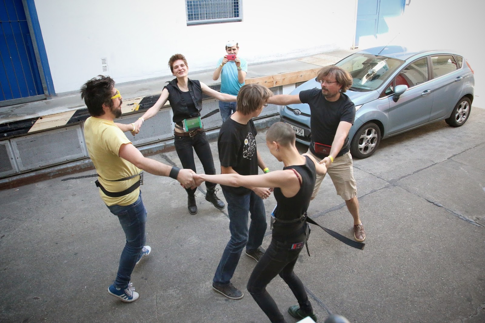 Go! Power Team! draws upon very simple objectives, stage and costume as contexts, and rules that cannot be policed. It designed to get players to perform and make each other laugh, and to interact with a whole crowd of participants.