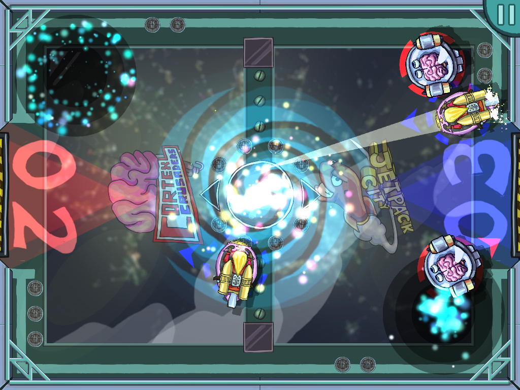 To create the effect of a player zipping from planet to planet, as TVs showing the latest Slamjet Stadium matches follow them, I built a system for scripting the UI as plist files. The result is a dynamic UI that feels alive and where important game events (e.g. goals scored) have screen-filling impact.